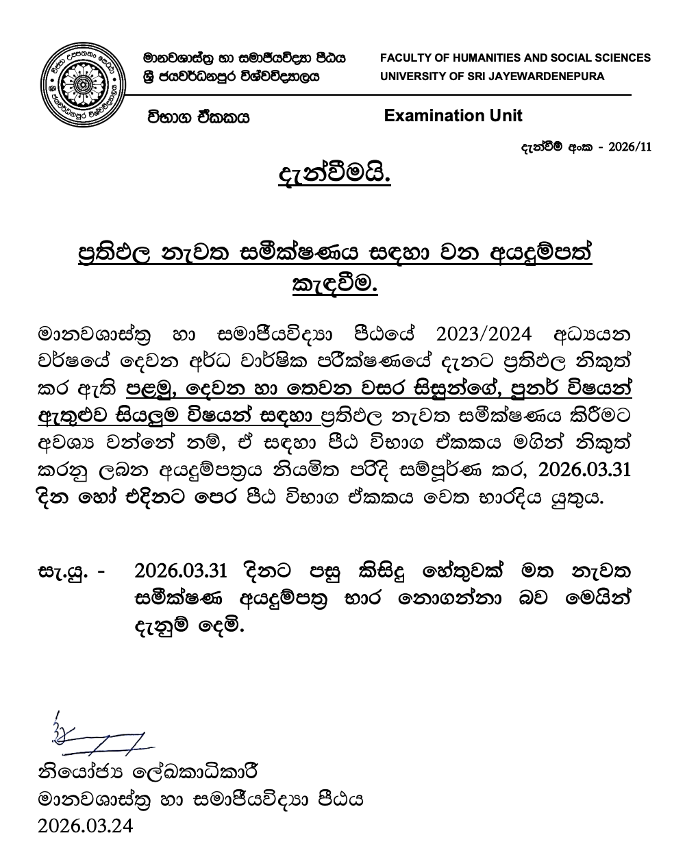 ප්රතිඵල නැවත සමීක්ෂණය සඳහා වන අයදුම්පත් කැඳවීම. by Admin LMS - Wednesday, 25 March 2026, 8:47 PM Number of replies: 0 Permalink